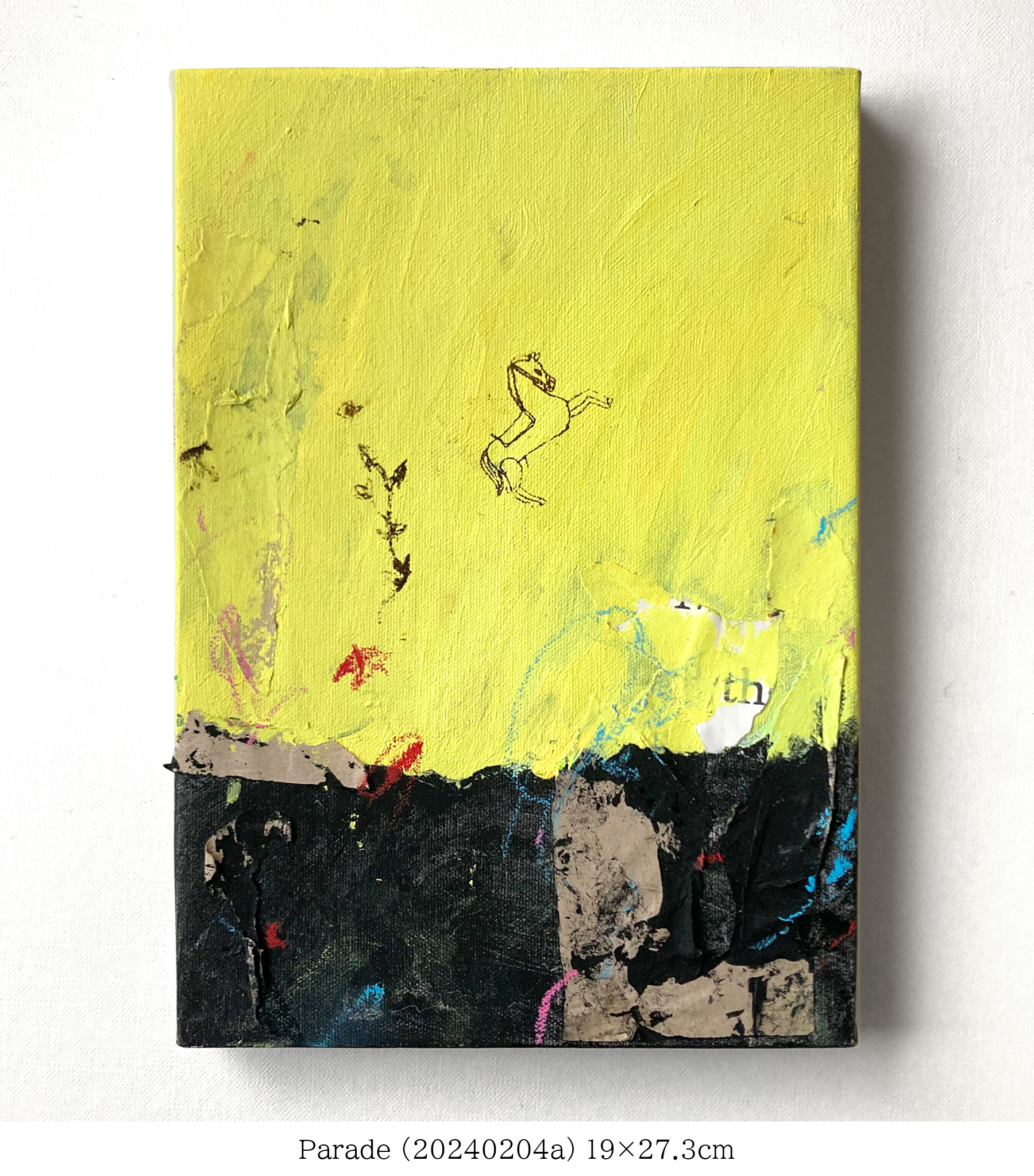 Parade 19×27.3cm 2024. Acrylic, silkscreen,mixed media on canvas. For inquiries, please contact SATO GALLERY from here. |