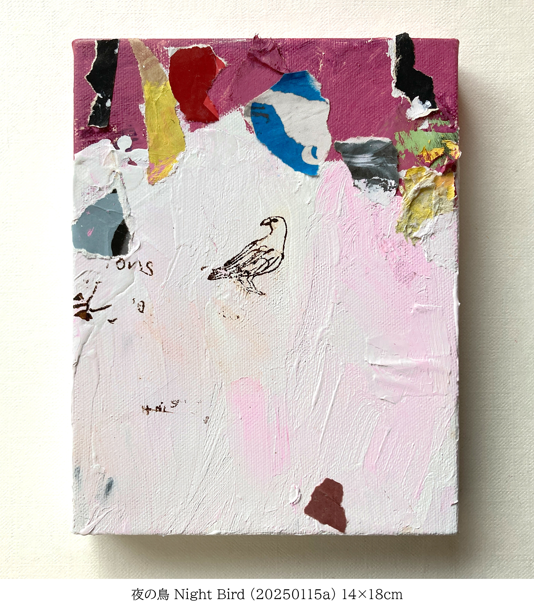Night Bird 14×18cm 2025. Acrylic, silkscreen,mixed media on canvas. For inquiries, please contact SATO GALLERY from here. |